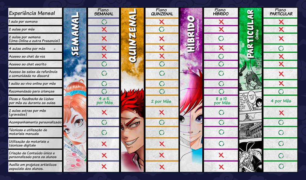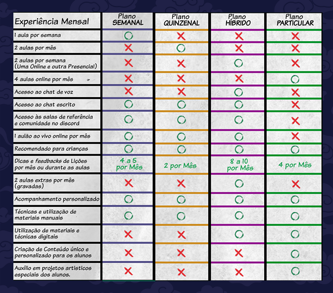 Nosso trabalho é como uma academia (só que de arte) em que você permanece até atingir seu objetivo e, quando decidir parar, é só avisar com antecedência e seguir os procedimentos de cancelamento do curso que lhe enviarei as regras da escola no e-mail.